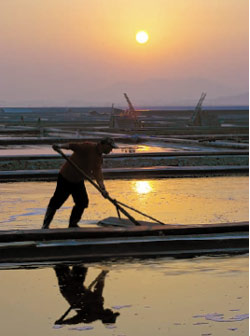 “소금장인들은 해 뜨기 전에 염전에 나와 물을 꺾습니다. 증발지에서 다음 증발지로 물을 옮기는 작업을 ‘물을 꺾는다’고 하지요. 바닷물이 결정지에 다다를 때면 염도가 22∼25도에 이릅니다. 27도가 되면 소금이 옵니다. 해 뜨기 전 결정지에 가둔 바닷물을 해 지기 전에 소금으로 생산하지 못하면 소금의 가치가 뚝 떨어집니다.”