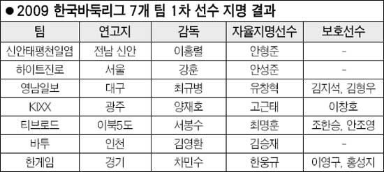 '2009한국바둑리그'에는 지난 해보다 한 팀이 줄어든 7개 팀이 참여한다. 지구촌을 강타한 경제 한파로 신성건설 월드메르디앙 울산디아채 등 '건설 3팀'과 제일화재가 빠졌지만 지난 해 우승한 네 팀(영남일보 한게임 티브로드 KIXX)에 신안태평천일염 바투 하이트진로가 새로 참여했다.